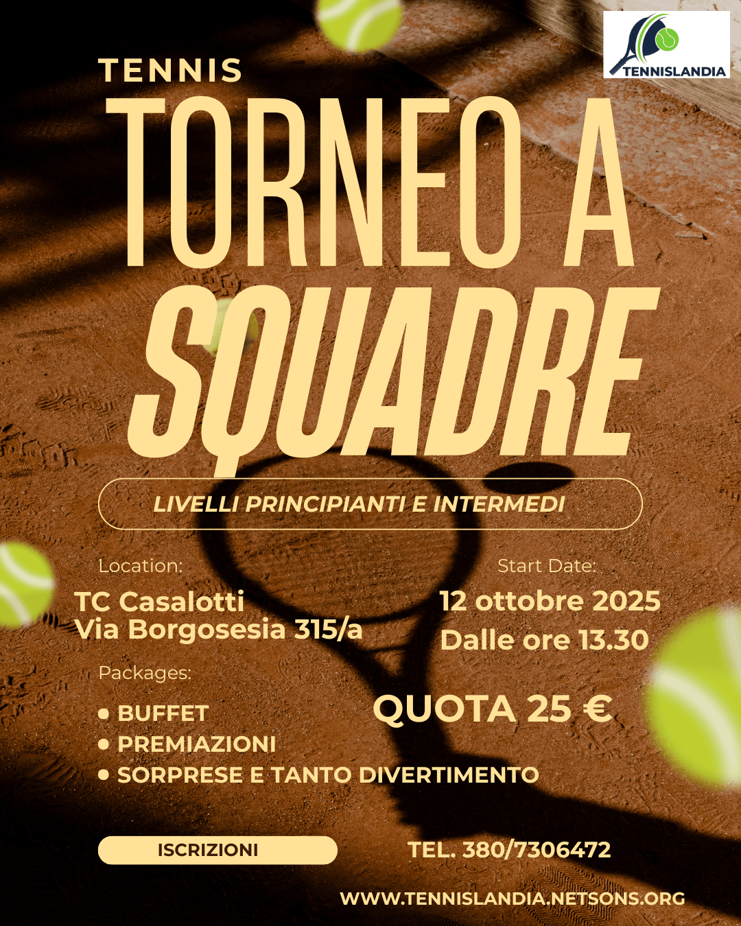 TENNISLANDIA nasce come gruppo amatoriale di tennis ed è aperto a tutti coloro che condividono la passione per questo sport straordinario. Con noi vivrai non solo partite emozionanti, ma anche nuove amicizie, allenamenti di gruppo (almeno una volta al mese) e serate conviviali con cena, per crescere insieme, migliorare la tecnica e celebrare ciò che ci unisce: la nostra grande passione, il TENNIS!